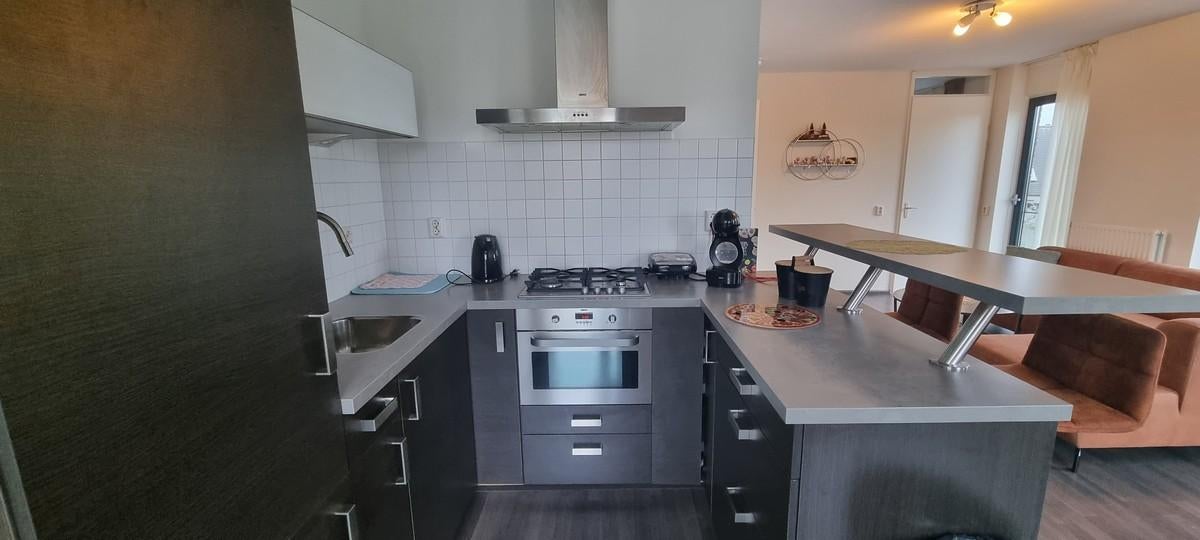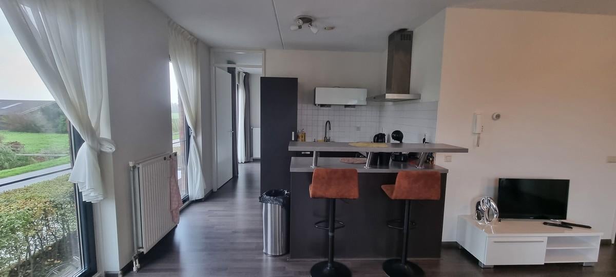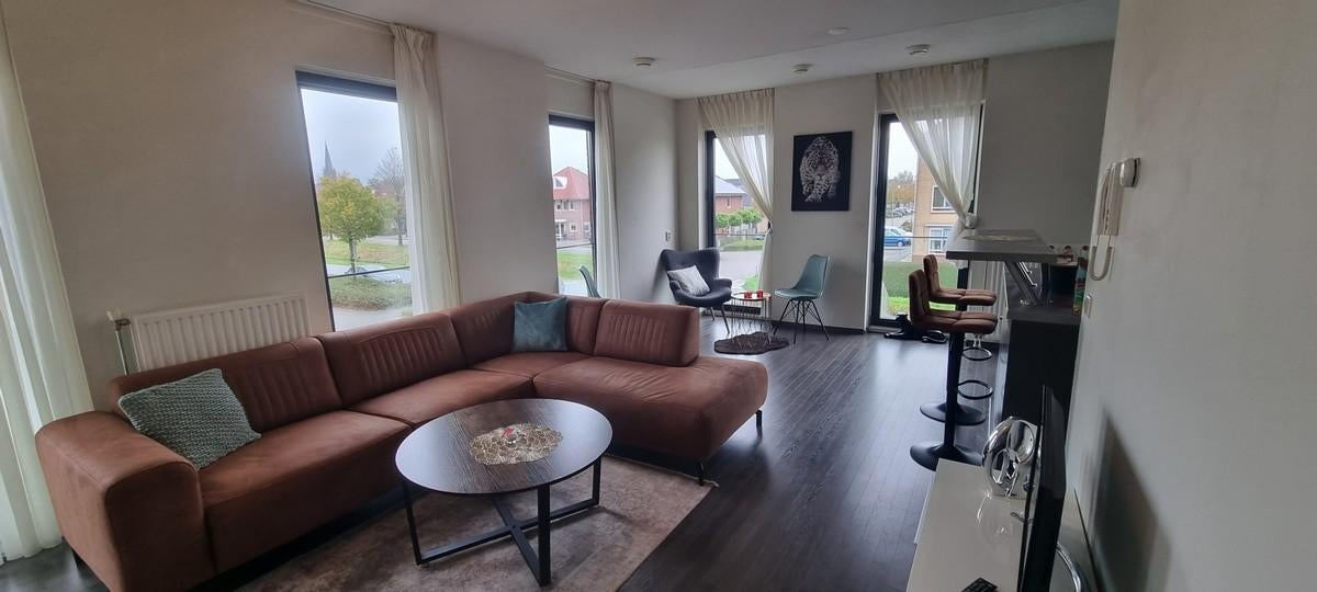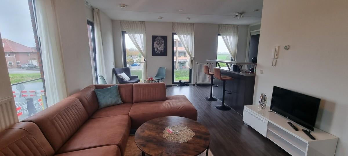 Gezellige woonkamer met grote raampartijen die allen geheel open kunnen en een Frans balkon hebben, een open keuken in U opstelling voorzien van een Koel/vries combi, combi oven, gasstel en afzuigkap.