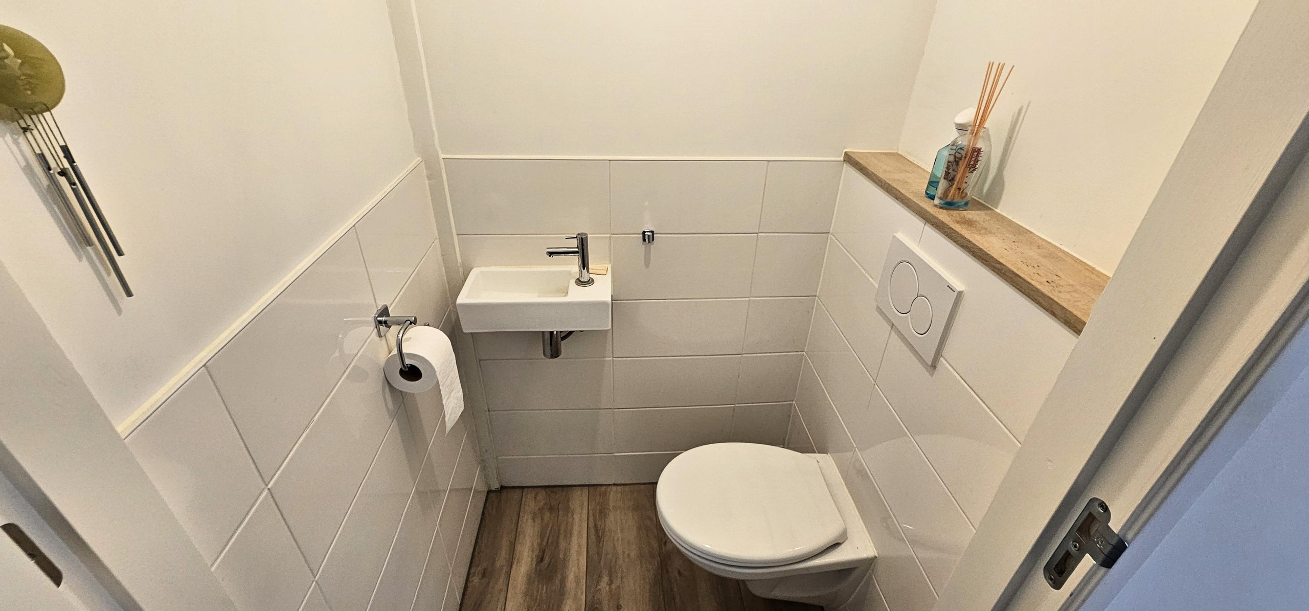 Bij binnenkomst treft u een entree met hal, meterkast en een modern toilet met fontein. De badkamer is keurig afgewerkt en voorzien van een douche en een moderne wastafel met ombouw.