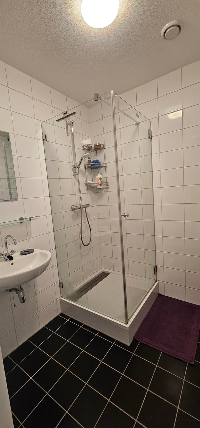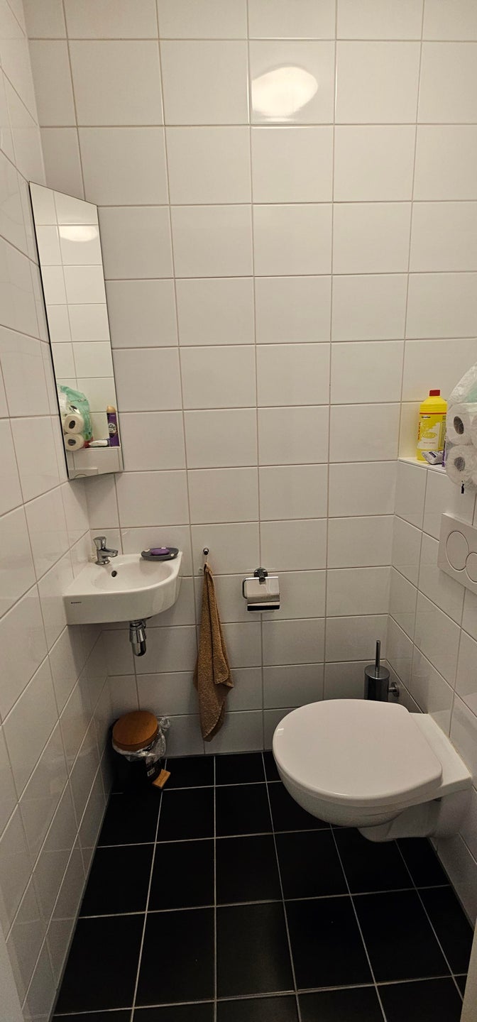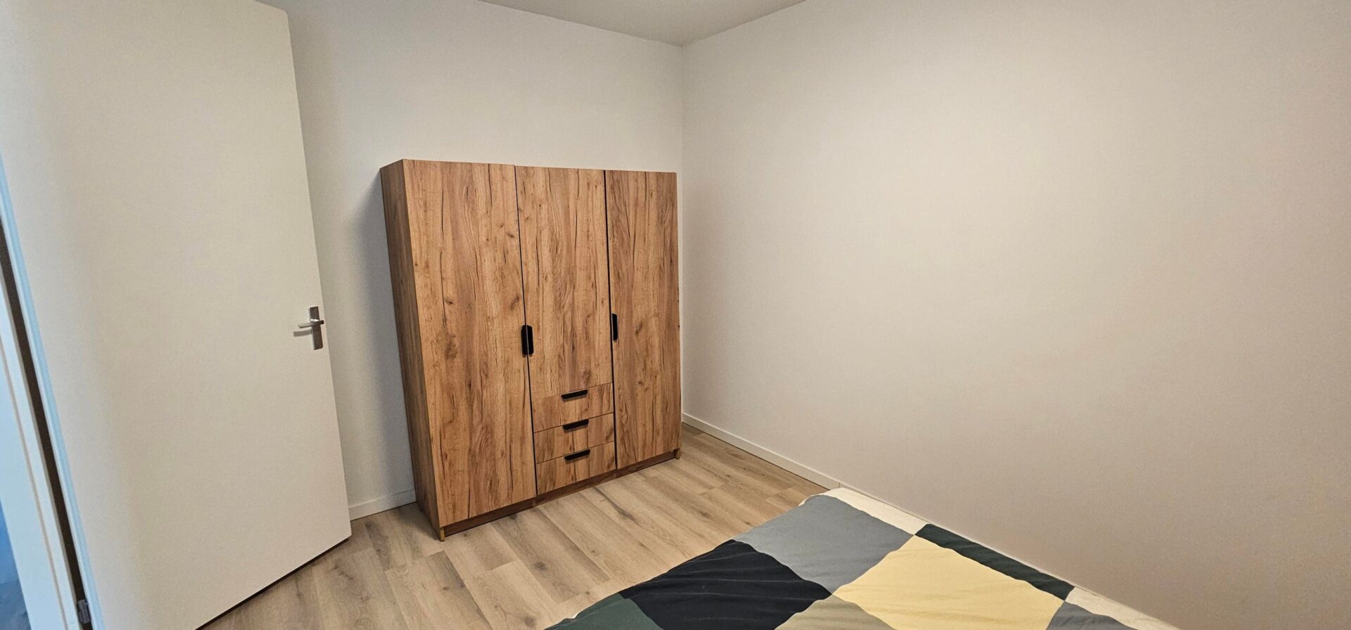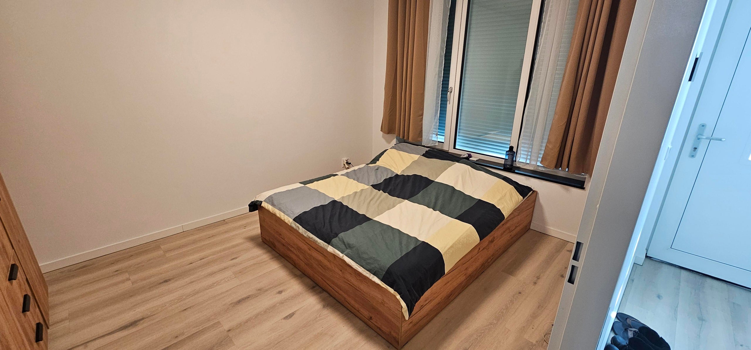 Binnenkomst in de hal, waar aan de voorzijde twee slaapkamers van goed formaat zijn gelegen. Aan de linkerzijde bevindt zich de moderne badkamer met wastafel en ruime douche. Rechts van de hal is een separaat toilet. Door de gehele woning ligt een lichte, stijlvolle PVC-vloer.