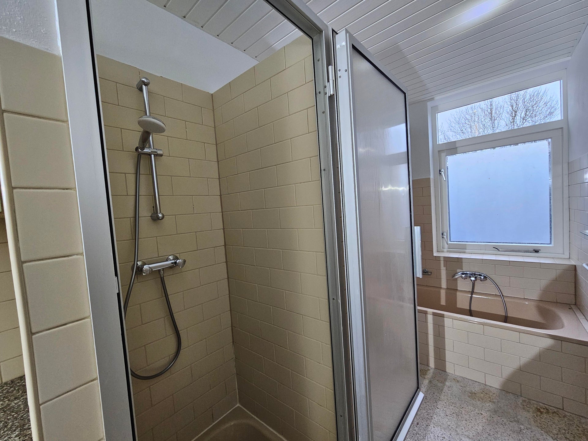 1 slaapkamer en een badkamer met wastafel, douchecabine, bad en toilet.