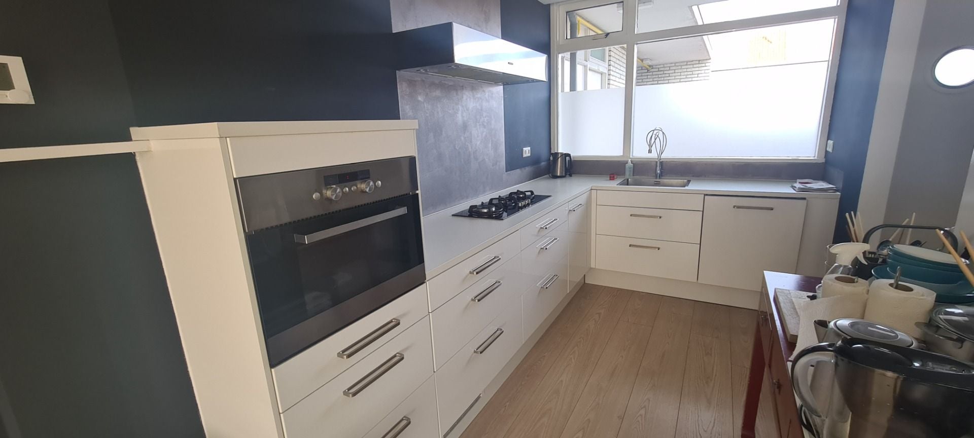 De ruime woonkamer voorzien van hoge raampartijen welke zorgen voor veel natuurlijk lichtinval, toegang tot het balkon (12m2) aan de achterzijde. De ruime open keuken voorzien van diverse inbouw apparatuur met o. a Vaatwasser, 3 pits gasfornuis, Combi-oven, en koel/vriescombinatie.
