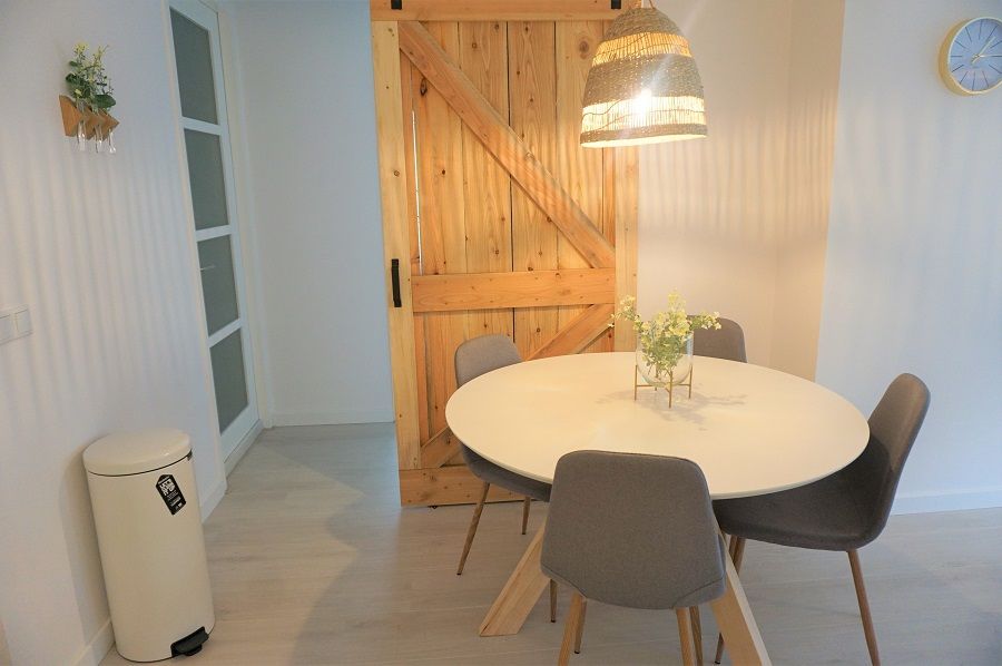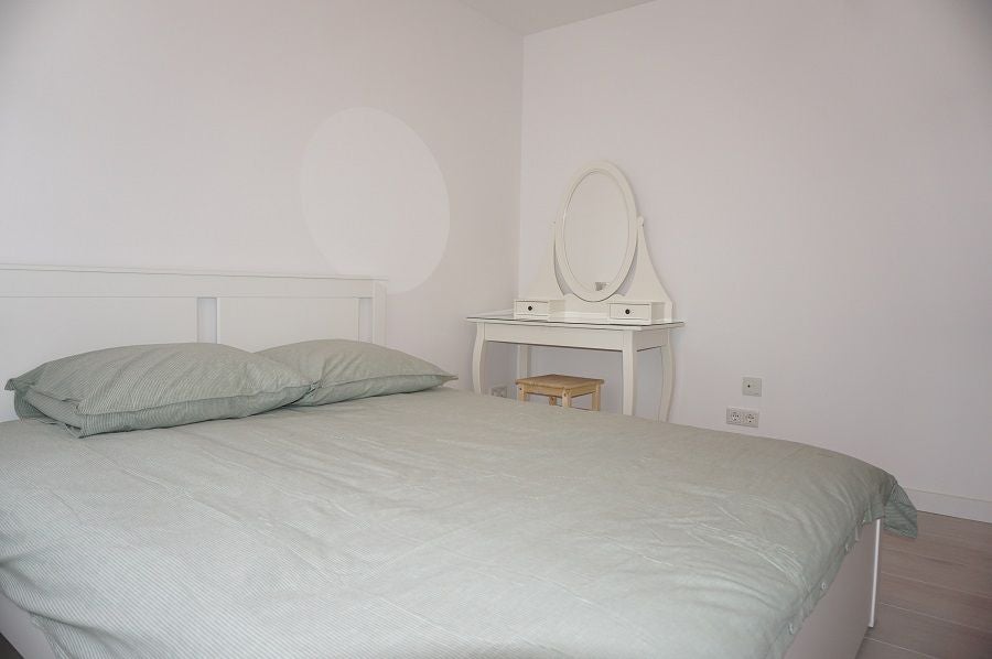 Via a modern sliding door you reach the other rooms, on the right you will find the master bedroom with a spacious double bed, cupboard, desk and chair.