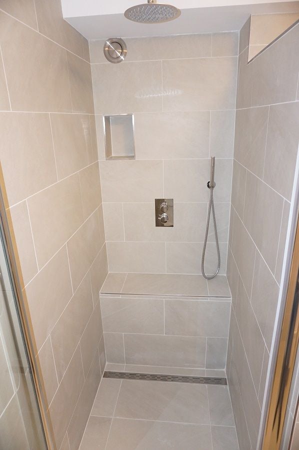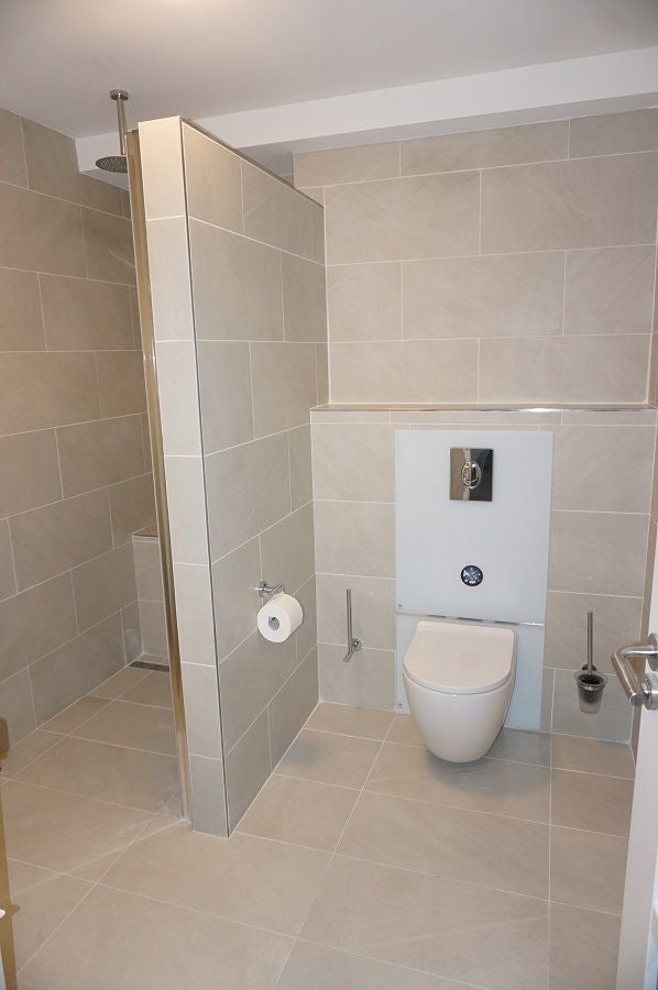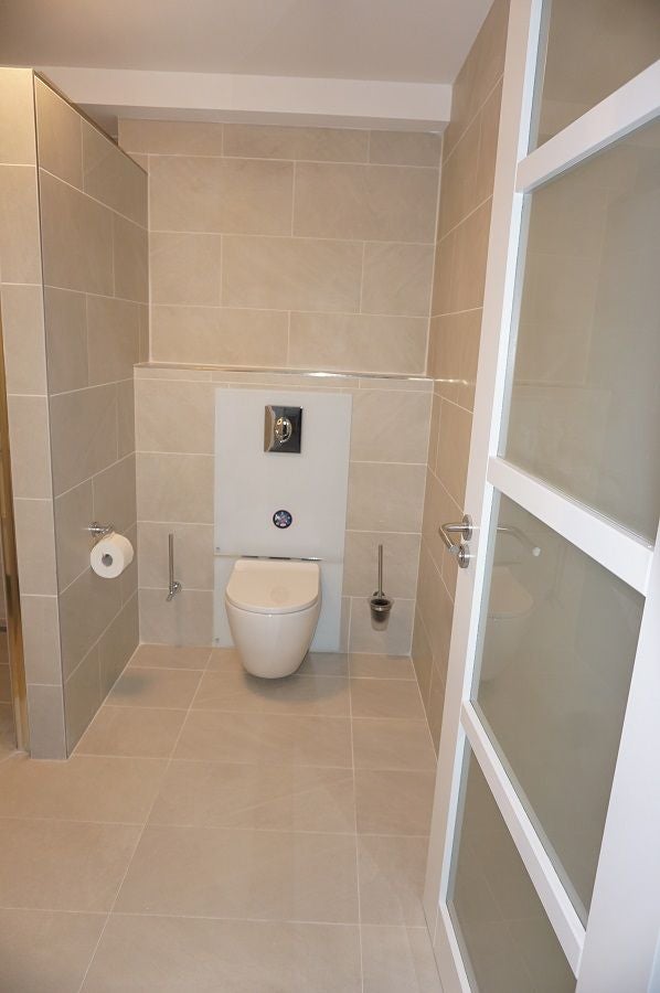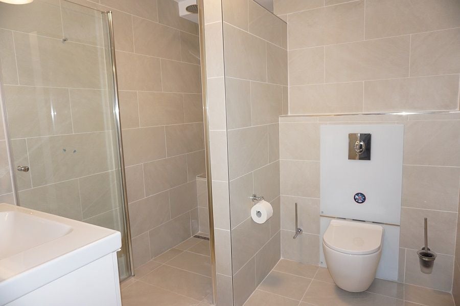 De badkamer is luxe uitgevoerd en voorzien van een inloop (stort) douche, toilet, wastafel met ombouw en spiegel.