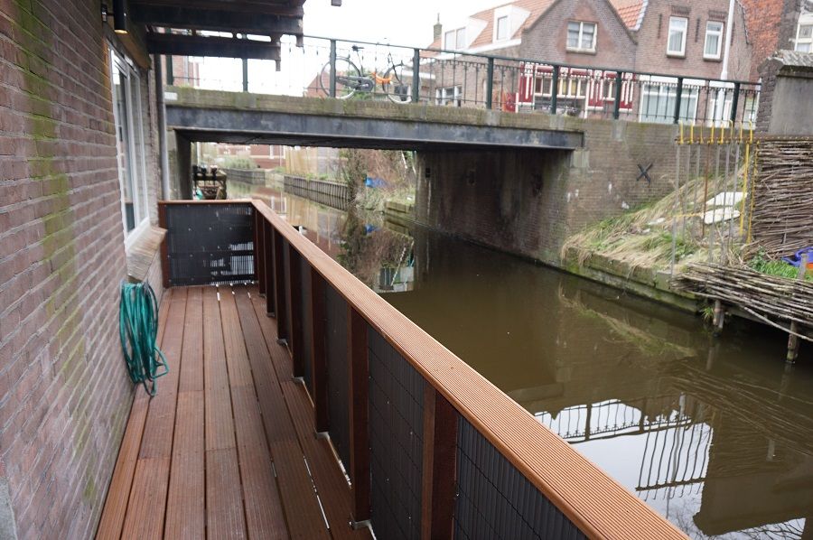 Aan de zijkant van de woning is over de gehele lengte een terras gecreerd met uitzicht op het water.