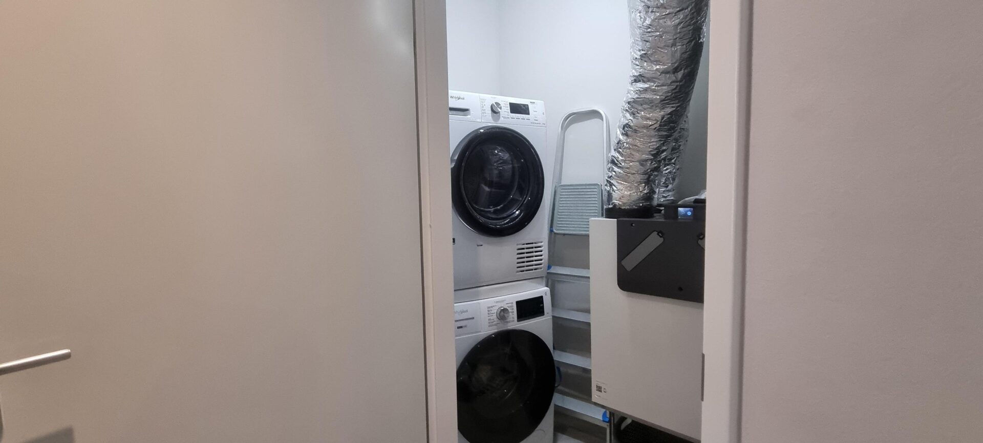 Lange hal, met separaat toilet, aparte ruime met wasmachine/droger opstelling, moderne badkamer met douchehoek, wastafel en 2e toilet, 1 ruime slaapkamer met tweepersoonsbed, 1 kleinere slaapkamer met grote kledingkast.