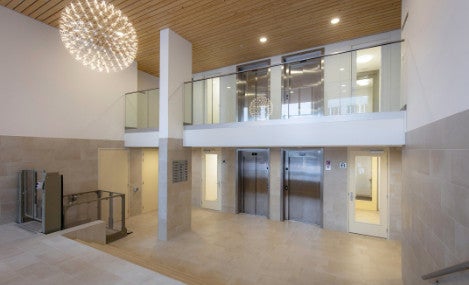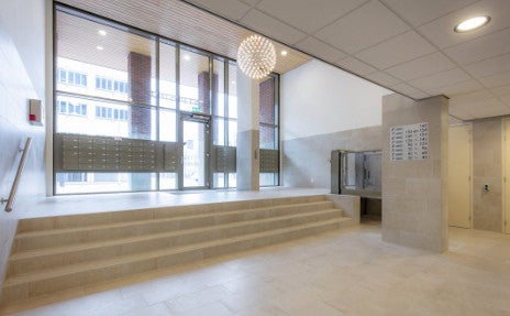 De entree met bellentableau, brievenbussen, lift en trappenhuis heeft een luxe rustige uitstraling.