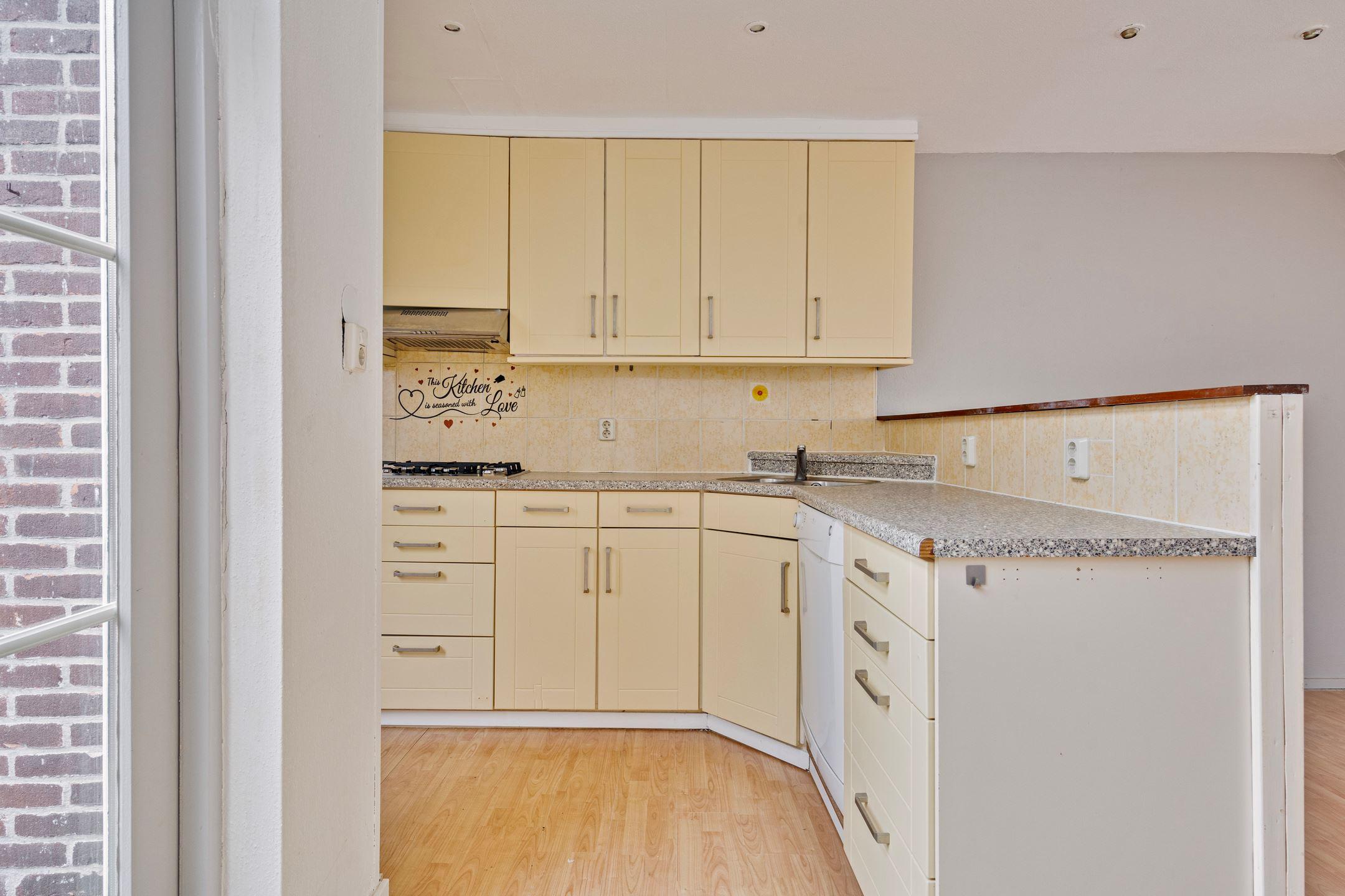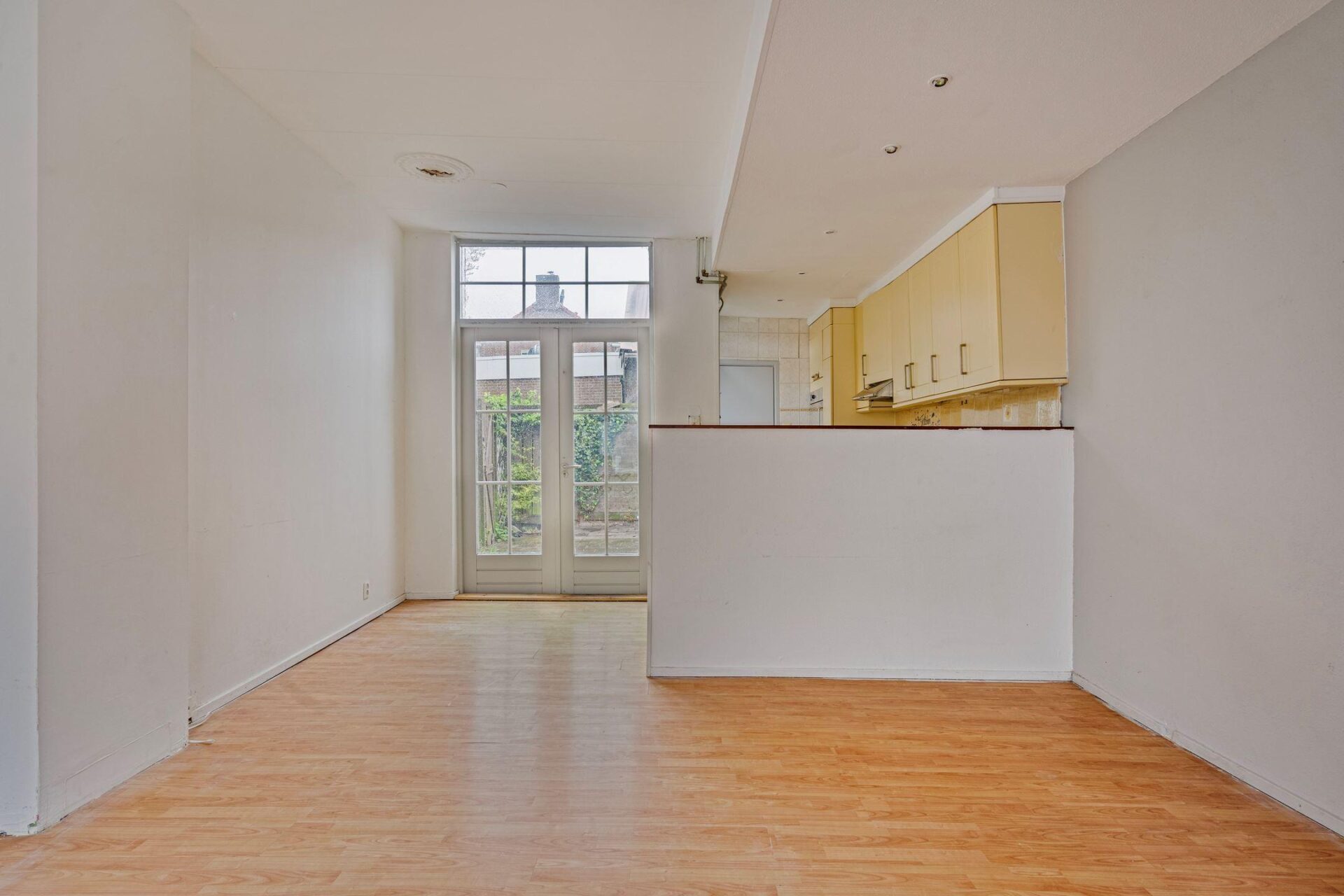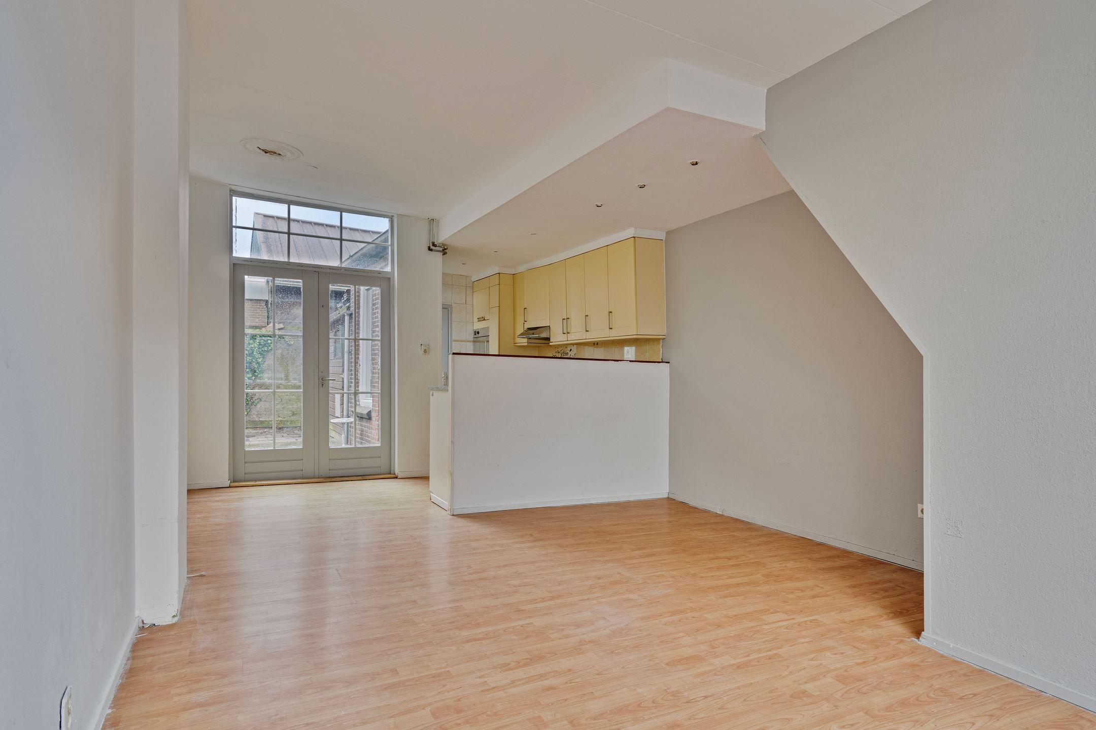 De lichte en leuk ingedeelde woonkamer met open keuken en openslaande deuren welke toegang geven tot de achtertuin.