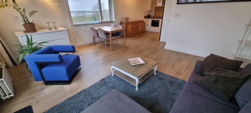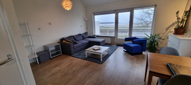 Entree, hal met gerenoveerd toilet, kleine bergkast. De ruime woonkamer met grote ramen waardoor er veel licht inval is, heeft een open keuken in L-vorm met diverse inbouwapparatuur en toegang tot het ruime zonnige balkon met uitzicht over het Markermeer en het strand wat bijna gereed is..