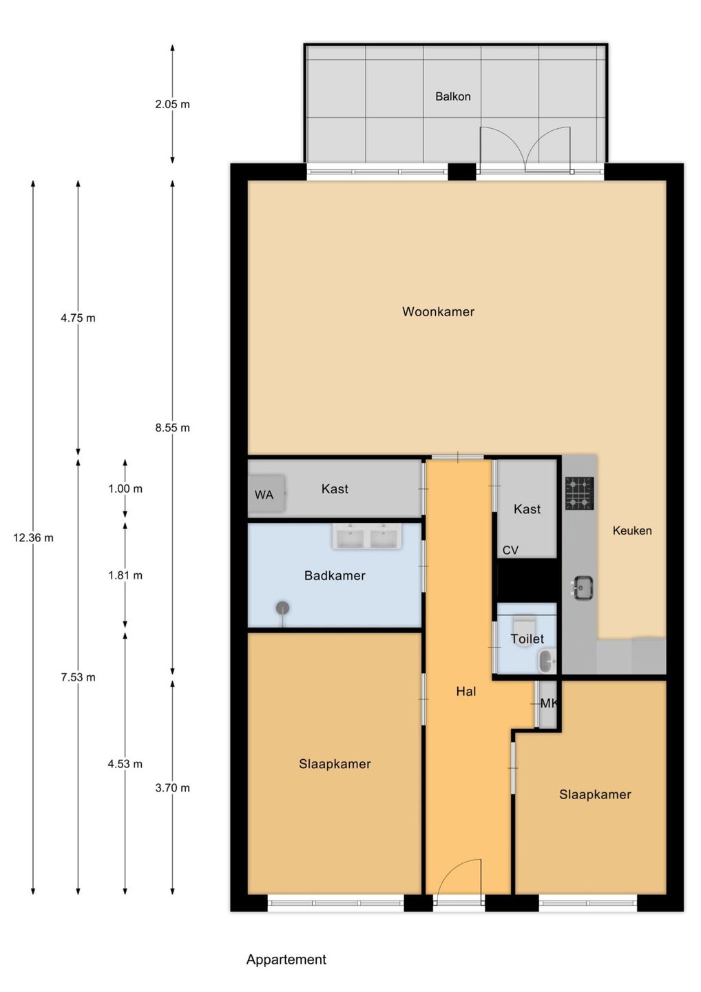Aparte bergruimte met opstelling CV-installatie, berging met aansluitingen wasmachine en -droger. Woonkamer met gevelhoge raampartijen en dubbele openslaande deuren naar balkon op het westen. Half open keuken in hoekopstelling voorzien van diverse keuken apparatuur