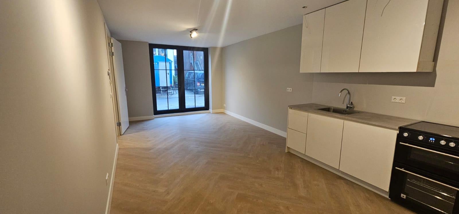 Indeling: Gezamenlijke entree, toegang appartement, woonkamer met openkeuken, badkamer met douche, dubbele wastafel en 2e toilet, separaat toilet, kast met wasmachineaansluiting, 2 slaapkamers waarvan 1 met toegang tot de tuin met achterom.