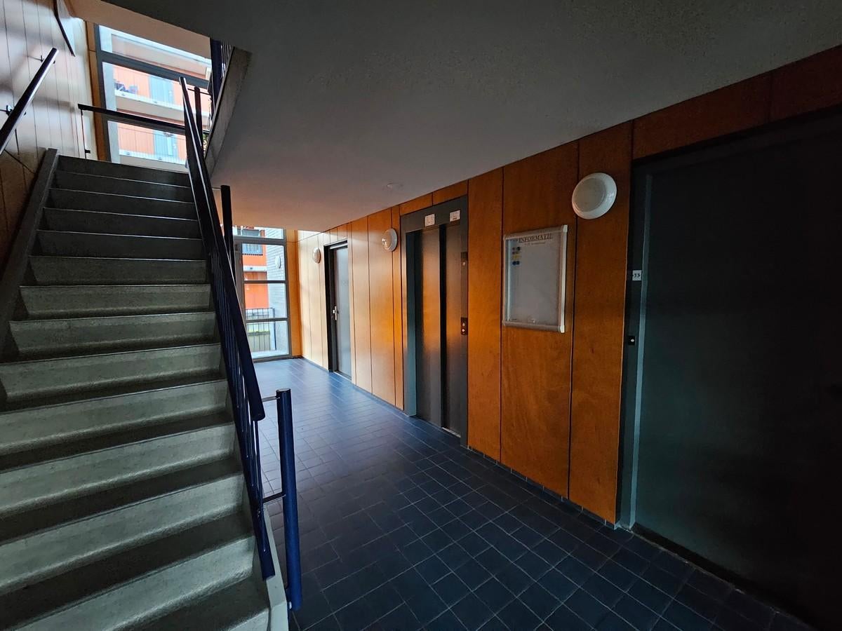 Centrale afgesloten toegang met bellentableau en brievenbussen.